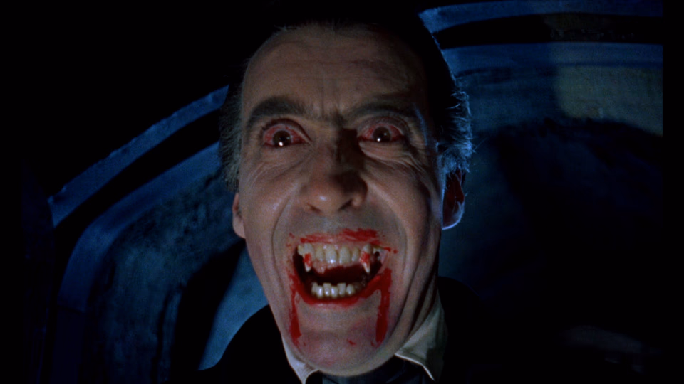 Just then, Count Dracula (Christopher Lee) explodes into the room. Lee is feral and demonic. The camera zooms in and Lee’s bloodshot eyes pin us to our seats. His gore-smeared mouth twists into a snarl, revealing blood-covered fangs. The shot lasts seconds but packs a punch. This is Dracula in his visceral glory.