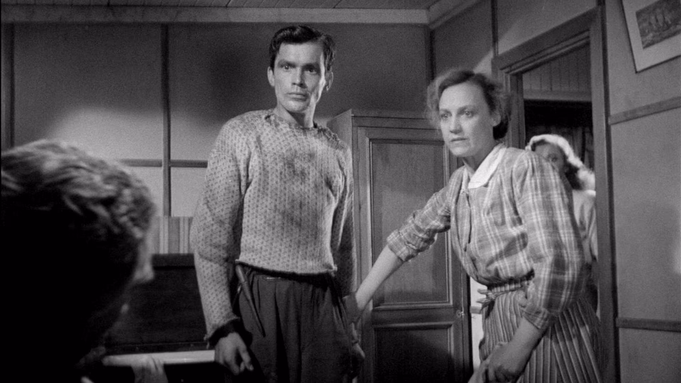 After an awkward framing device, we get to the meat of the story. Set on a salvage boat working just off the coast, Birger Malmsten plays Johannes, the hunchback son of the tyrannical Captain Blom, played by Holger Löwenadler. Blom plans to leave his family and run off with his mistress Sally, whom he’s brought to live on the ship much to the dismay of his long-suffering wife, Alice. Soon a triangle forms between the naive Johannes, the hard-hearted Sally, and Blom.