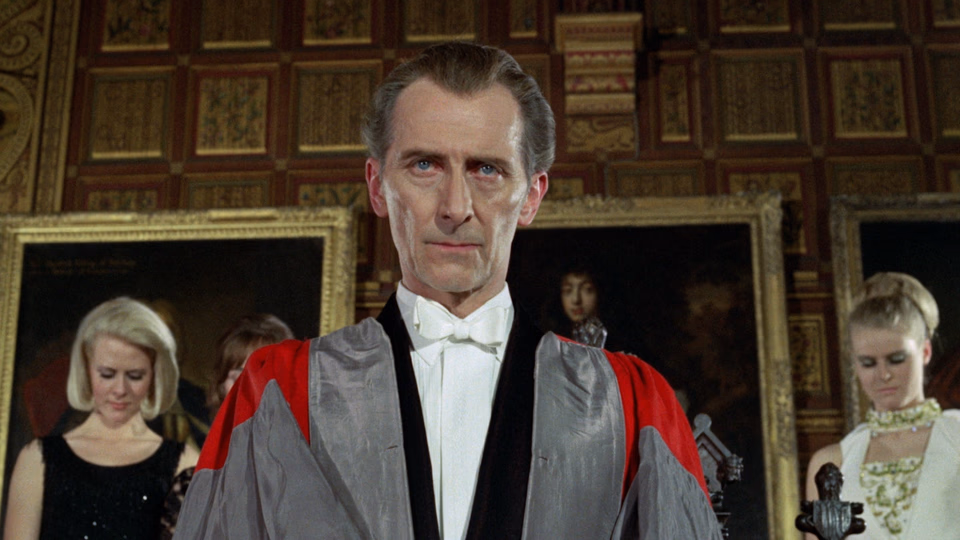 But the plot and subtext don’t convey the rollercoaster viewing experience. Consider the opening. After a lengthy bit of Dragnet-style voice-over narration from Tony that introduces the plot and all the characters, Tony arrives at Oxford where he meets Penelope, Richard’s “informal” fiancée, her father, the Oxford Provost, played by Peter Cushing, and Bob, Richard’s star pupil and close friend.