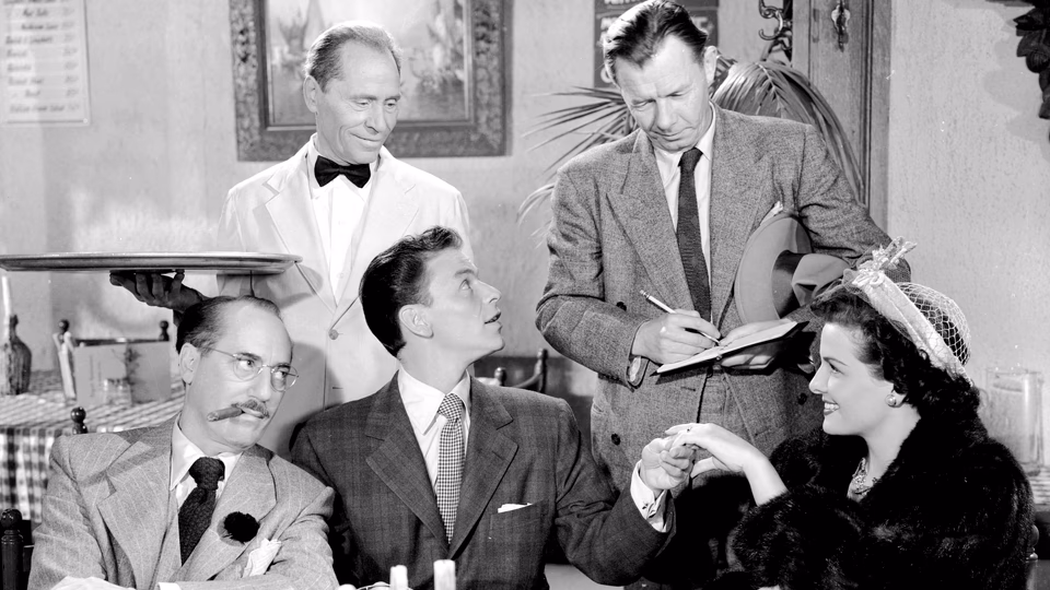 The plot—such as it is—sees Sinatra play a timid bank teller who goes into hiding with Marx, a waiter at his usual lunch spot, after his reward for saving a bookie’s life coincides with a shortage at his bank, leaving his girlfriend, Russell, believing he’s turned bandit. It’s a premise that might have worked as screwball comedy, but the film seems embarrassed by its own potential for zaniness.