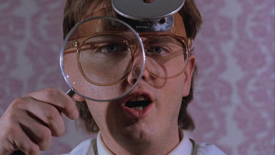 Soon, Jeffrey’s in a flop-house room with a bevy of sex workers. They think they’re indulging his fetish as Jeffrey, dressed in medical gear complete with a head mirror, inspects their bodies with a magnifying glass. The scene provides ample shots of naked breasts, legs, and buttocks, but Jeffrey’s excitement isn’t one of arousal but of engineering. He’s found the perfect set of parts. Now he just has to pick one girl.
