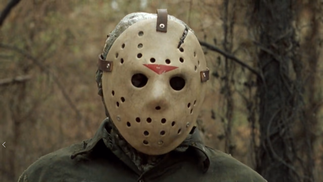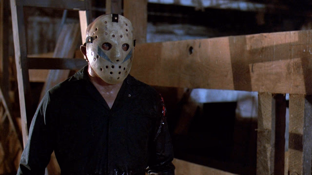 Still no hockey mask, but we have Jason (sporting a burlap sack over his face) stalking a group of camp counselors.