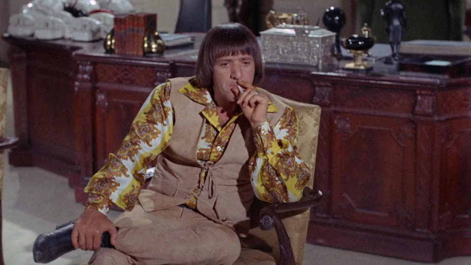 The tone and production style of the satirical fantasy sequences evoke the then-contemporary Batman television series—complete with George Sanders as the celebrity villain. Friedkin proffers some novel camera angles—bird’s eye views and high-corner shots—but can’t overcome the production’s innate flaw.