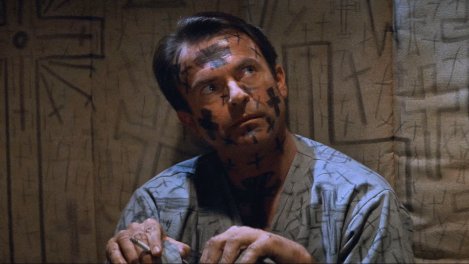 Neill is terrific. He gives us a skeptic’s slow descent into madness without overselling a single moment. His determination feels authentic, not movie-stupid. When his sanity cracks, we feel the betrayal. The scene where he wakes on a tour bus full of elderly tourists and immediately starts screaming has become iconic for good reason. So has the moment where he sits alone in a movie theater, watching his own life unfold on screen, laughing hysterically at the cosmic joke.