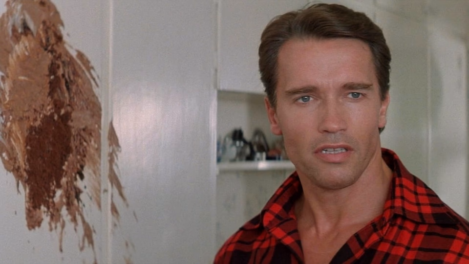 Featuring one-liner’s like “You should not drink and bake,” the script isn’t exactly snappy. The early scenes at home between Arnold and his wife (from which the above line is lifted) are the low point, with dialog so stilted you’d swear the performers were reading it from cue-cards, but thankfully, the wife disappears pretty quick and things start to gain momentum, building to the classic action movie climax where Arnold, armed with a ridiculous amount of firepower, takes out the entire Chicago mob.