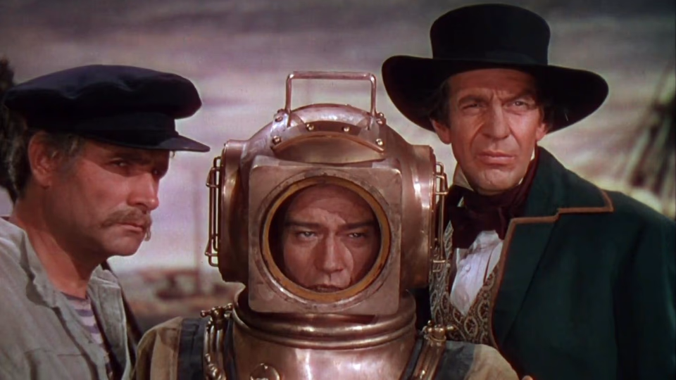 Wayne plays a sea captain who, as the film opens, is unconscious, having been knocked out by a treacherous first mate who’s been paid to scuttle the ship by an underhanded salvager, played by Raymond Massey.