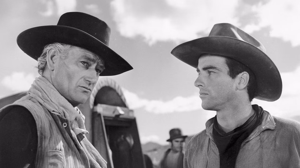 The story follows Dunson, a cattle baron facing financial ruin after the Civil War, as he leads a massive herd north to the Missouri railroads. What begins as an act of salvation becomes a descent into tyranny, as Dunson’s desperation transforms him into a monster. Montgomery Clift, in his film debut, plays Matt Garth, Dunson’s adopted son, whose growing opposition to his father’s methods drives the film’s central conflict.