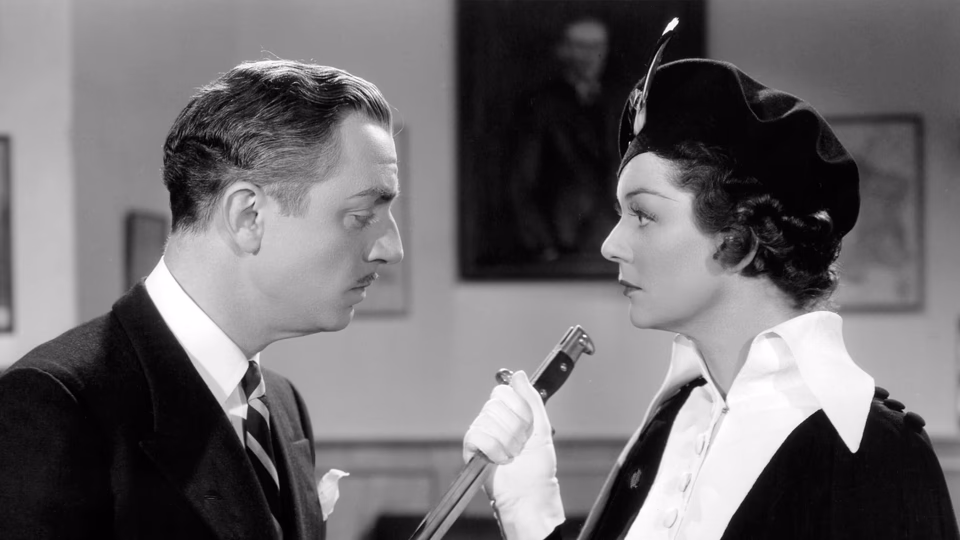 For a while, it works. Russell channels Myrna Loy (who was in a contract dispute with MGM) with surprising spark. She and Powell generate real heat in their early scenes. After Russell spikes his coffee with sleeping pills (because he’s working too hard, you see), Powell shoos her out and tells a guard: “If she tries to get in again use your gun. Don’t shoot to kill, just wing her. I don’t want her haunting me!” Good stuff.
