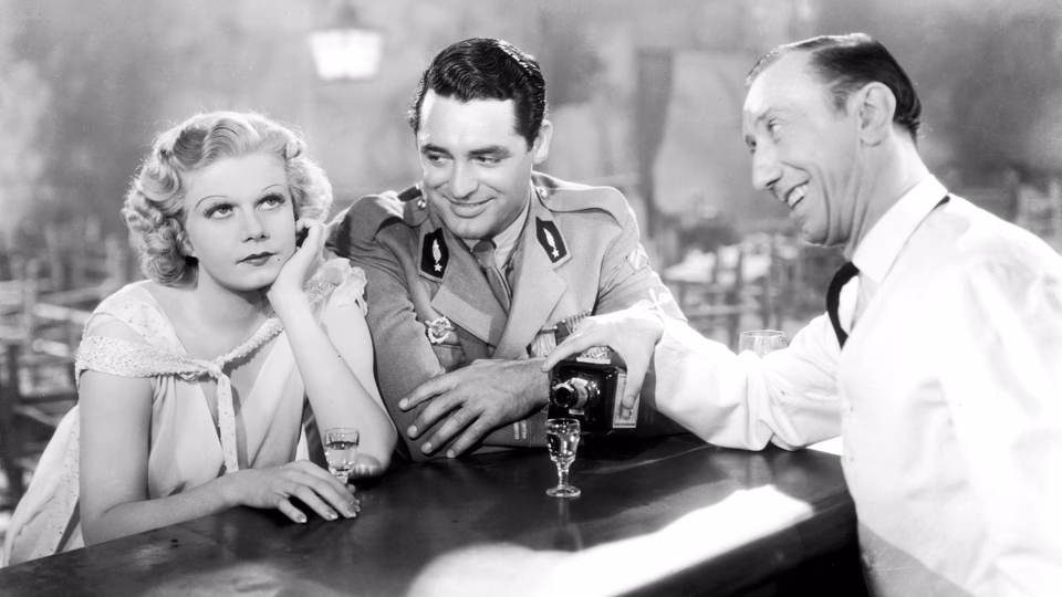 Harlow flees to Paris, where she gets a job in a cabaret. Thirty-one minutes into the film, she meets Grant, a hotshot ace pilot. Grant plays Grant and doesn’t convince in the part, but still proves a welcome presence. They fall in love and marry. Grant, who comes from money, takes her to his ancestral estate, where Harlow will live with his father.