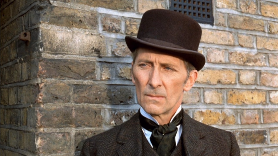 Cushing tries to make these exposition-heavy investigation scenes work using his trademark prop-work. An early scene has him bemoaning a wet tea saucer. Later in the morgue, he’s fidgeting with his hat. And in my favorite bit, a field crime scene sequence sees him chewing—Huck Finn style—on a bit of straw. But it’s not enough.