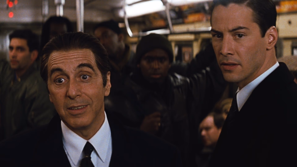 Reeves, often maligned for his limited range, is perfectly cast. His earnest, somewhat blank quality works for a character who’s meant to be corruptible, who’s hiding his own moral vacuum behind a facade of righteousness. He’s not movie-star handsome enough to seem implausible as a Florida attorney, but carries enough charisma to convince as an undefeated litigator. When Al Pacino’s New York law firm comes calling, Reeves takes his wife (Charlize Theron) to the big city, where the real show begins.
