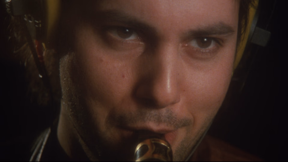 Consider the opening scene, set in a recording studio. Jessica watches Johnnie lay down his jazz sax. Fulci—brandishing his trademark—cuts to close-ups of their eyes as Johnnie stares at Jessica as he plays. She’s visibly aroused by the sound and attention. In between takes, the pair starts making out, with Johnnie groping and exposing her breast. This leads the rest of the recording crew to break for coffee. Unzipping his fly, Johnnie then wants a quickie, but Jessica says no. Frustrated, Johnnie zips himself up, steps back, and picks up his sax. He places the bell under Jessica’s skirt, and proceeds to blow a solo that sends Jessica to orgasm.