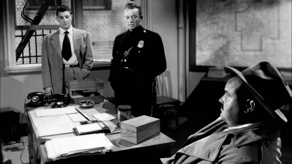 But as the film settles in, the precinct fades into the background. Mitchum partners with a junior officer named Johnson, played by William Talman. Early on, Talman catches on to the racket’s influence.