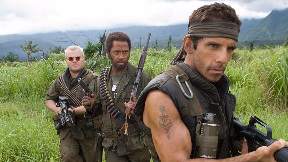 The setup is simple. Three pampered actors get dropped into real jungle warfare while filming a Vietnam War movie. Stiller’s fading action star, Robert Downey Jr.’s method actor in blackface, Jack Black’s fart-comedy specialist. They think they’re still making a movie. The bullets are real.
